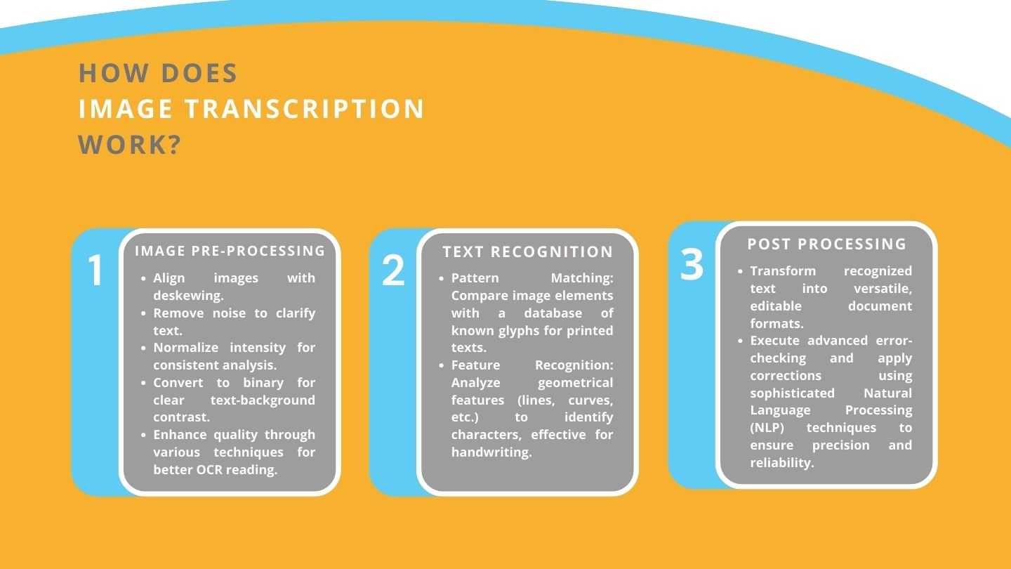 The efficiency of AI in image transcription can be further improved when combined with Natural Language Processing (NLP). Since NLP aims to make AI systems understand language the same way as humans, it can also facilitate the output of image transcription. Because even if the OCR system makes errors in the final output, the use of NLP can correct those errors by understanding the context of the text and determining the correct word.